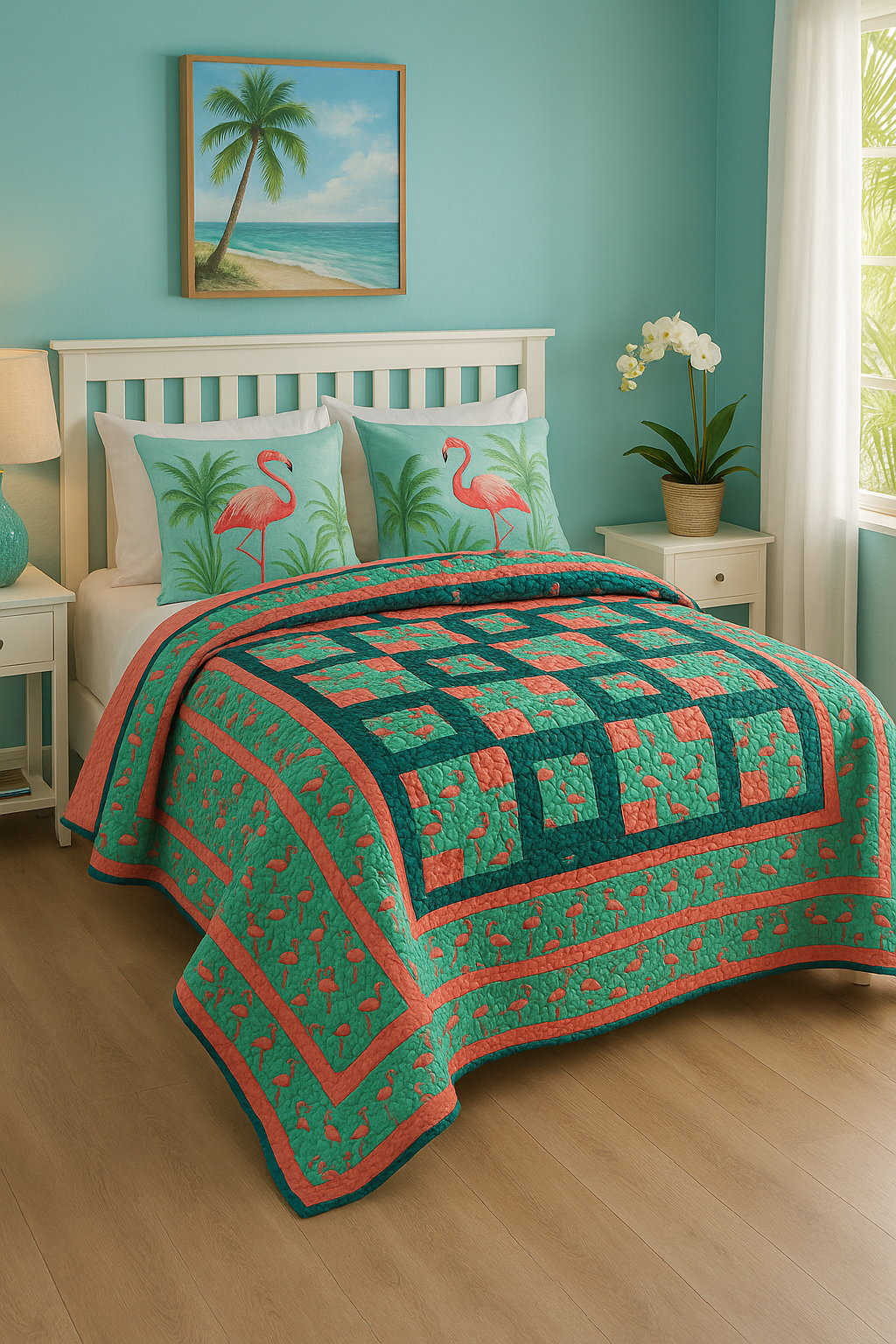 Transform your living space with the vibrant charm of our Flamingo Quilt, meticulously pieced by artisan Kelee Guillory and expertly quilted by Six Mile Quilting. Measuring 45x50 inches, this handcrafted masterpiece is a perfect blend of artistry and comfort, offering a cozy embrace while adding a splash of color to any room. The quilt's striking flamingo design is not only a testament to skilled craftsmanship but also a unique statement piece that elevates your home décor. Ideal for draping over a sofa or layering on a bed, it promises warmth and style in equal measure. Embrace the allure of this one-of-a-kind quilt and transform your home into a haven of creativity and comfort.