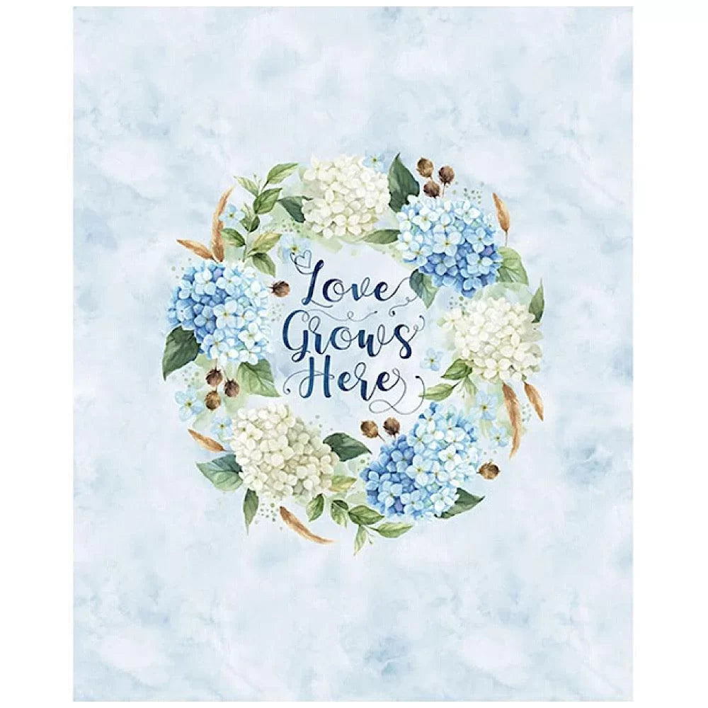 Infuse your projects with the timeless beauty of nature using the Hoffman Hydrangea Panel from the Celebrate the Seasons collection. This exquisite fabric panel, measuring 35.5" x 43", showcases a vibrant wreath of delicate blue and white hydrangeas encircling the heartfelt message, "Love Grows Here." Perfect for quilting enthusiasts and home decor aficionados, this panel adds a touch of elegance and warmth to any creation. Its vivid colors and intricate design make it ideal for wall hangings, quilts, or decorative accents. Transform your space with the serene charm of hydrangeas and celebrate every season with style.