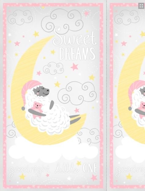 Transform your nursery into a whimsical dreamland with the "One Sheep Two Sheep" fabric panel by Wilmington Prints. This enchanting panel features a serene sheep cradling a teddy bear on a crescent moon, surrounded by fluffy clouds and twinkling stars. The soft pastel hues of pink, yellow, and grey create a calming atmosphere, perfect for soothing your little one to sleep. Ideal for crafting cozy quilts or charming nursery decor, this fabric panel adds a touch of magic to any baby room project. Let your creativity shine and wrap your child in warmth and comfort with this delightful design.