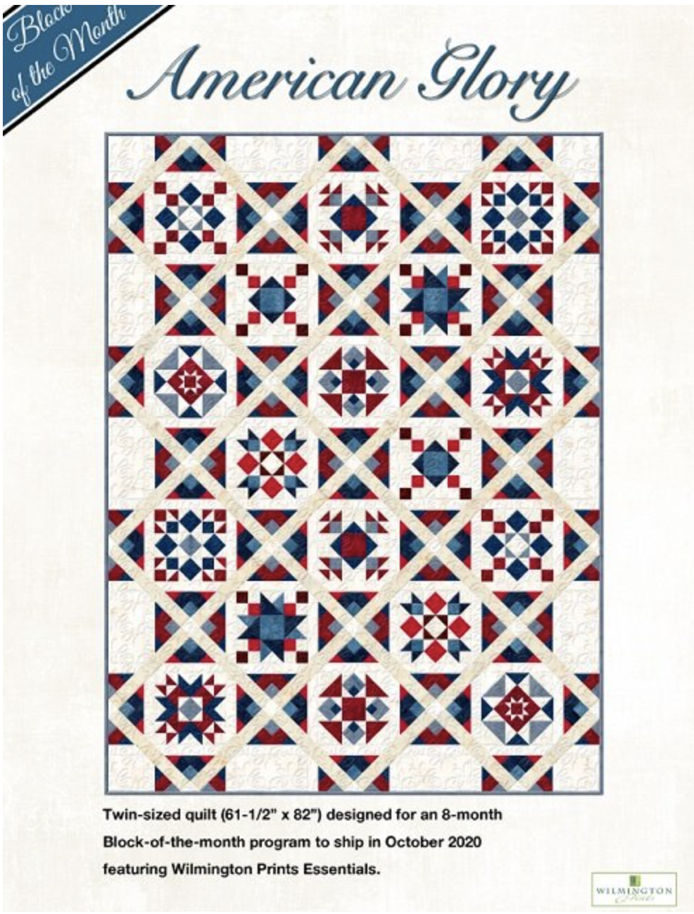 American Glory BOM- by Wilmington Prints- 8 Blocks, Twin Sized Quilt (61-1/2" x 82" ) using Wilmington Prints Essentials, 100% cotton, Pattern,Fabrics for the top of quilt and the binding. Backing and Batting not included in kit.
