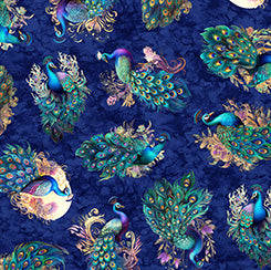 Transform your quilting projects into masterpieces with the Resplendent Tossed Peacocks fabric by Quilting Treasures. This vibrant fabric showcases a stunning array of intricately detailed peacocks, set against a rich, deep blue background. Each peacock is a symphony of colors, featuring iridescent blues, purples, and greens that shimmer with elegance. Perfect for quilters and creative sewing enthusiasts, this fabric elevates any project with its luxurious and eye-catching design. Whether you're crafting a quilt, a decorative pillow, or a unique garment, the Resplendent Tossed Peacocks fabric adds a touch of opulence and sophistication to your creations. Let your imagination soar with this exquisite fabric choice.