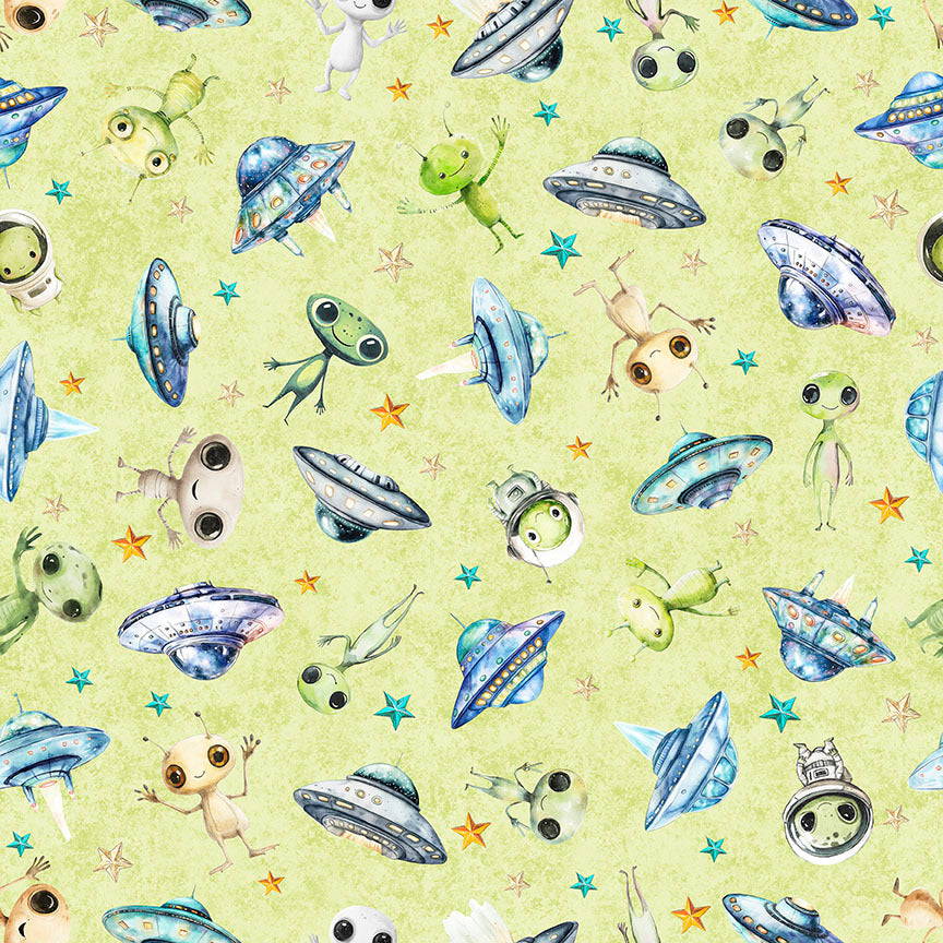 Unleash your creativity with the QT Cuties 3 - Aliens fabric by QT Fabrics, a must-have for quilting enthusiasts and craft lovers alike. This vibrant fabric features a playful array of whimsical alien characters and colorful UFOs set against a lively green backdrop, sparking imagination and fun in every project. Perfect for quilting, kids' crafts, or unique home decor, this fabric adds a splash of intergalactic charm to any creation. Made with high-quality materials, it ensures durability and a soft touch, making it ideal for projects that will be cherished for years. Transform your ideas into reality with this delightful fabric that promises to inspire and delight.