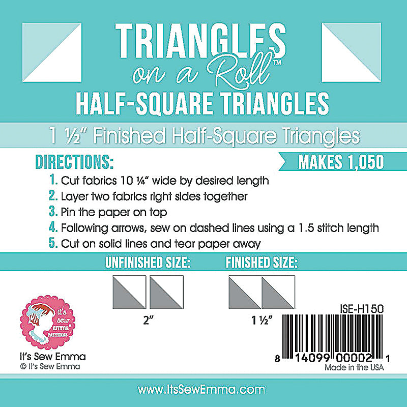 Quilters, elevate your craft with the Triangle On A Roll Half Sq 1.5 by It's Sew Emma. This essential tool simplifies the creation of precise half-square triangles, ensuring your quilting projects are both beautiful and accurate. Designed for efficiency, each roll can produce up to 1,050 perfectly sized 1.5" finished triangles. The easy-to-follow instructions printed on the roll guide you through cutting, layering, and sewing, making it ideal for both beginners and seasoned quilters. The vibrant teal packaging adds a splash of color to your sewing space, while the detailed directions ensure a seamless quilting experience. Save time, reduce fabric waste, and achieve professional results with this indispensable quilting companion.