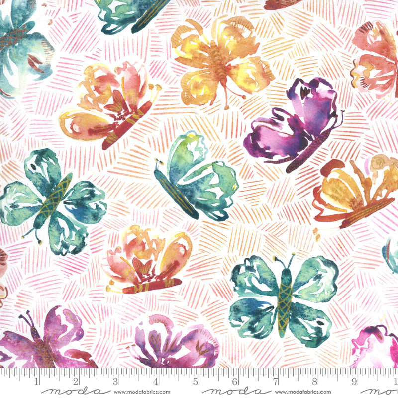 Bring a burst of color and joy to your quilting and crafting projects with the Sunshine Soul Sunset Butterfly fabric by Moda. This vibrant, high-quality cotton fabric features an enchanting array of watercolor butterflies in hues of teal, purple, and orange, set against a subtle, textured background. Ideal for creating eye-catching quilts, home décor, or unique apparel, this fabric's lively design adds a touch of whimsy and elegance to any creation. Let your imagination take flight with this stunning fabric, perfect for those who cherish creativity and vibrant aesthetics. Transform your projects into works of art with the Sunshine Soul Sunset Butterfly fabric.